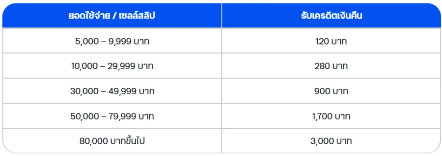 - จำกัดเครดิตเงินคืนสูงสุด 3,000 บาท / บัญชีบัตรหลัก / เดือน และสูงสุด 18,000 บาท / บัญชีบัตรหลัก / ตลอดรายการส่งเสริมการขาย (รวมทุกแบรนด์ที่ร่วมรายการ) โดยคำนวณการให้เครดิตเงินคืนจากยอดใช้จ่ายเต็มจำนวน หรือแบ่งชำระต่อเซลล์สลิป ตั้งแต่ 5,000 บาทขึ้นไป รับเครดิตเงินคืนตามขั้น (ดังตาราง) ไม่นับรวมเศษทศนิยม