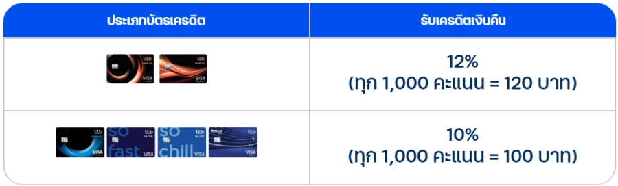- สำหรับบัตรเครดิต ttb ประเภทอื่นๆ ที่มีคะแนนสะสม รับเครดิตเงินคืน 10% (100 บาท)