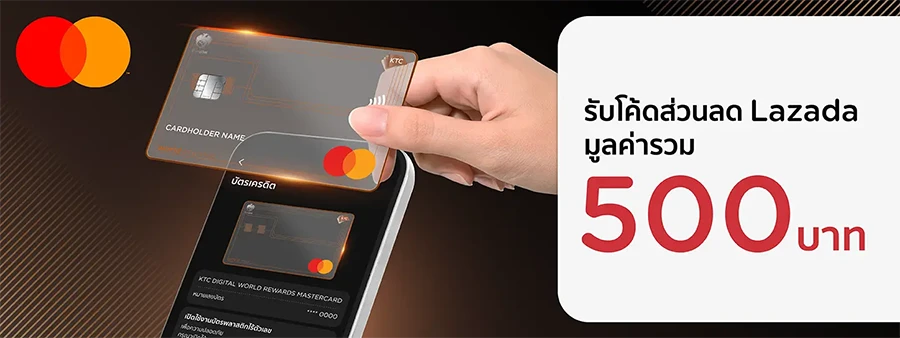 สมัครบัตรเครดิต KTC DIGITAL WORLD REWARDS MASTERCARD รับโค้ดส่วนลด LAZADA มูลค่ารวม 500 บาท เมื่อใช้จ่าย 3 รายการขึ้นไป ภายใน 30 วันนับจากวันที่อนุมัติบัตรฯ