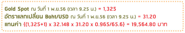 - อัตราแลกเปลี่ยน ในที่นี้จะสมมติอัตราแลกเปลี่ยนเป็น Baht/USD โดยสามารถดูได้จากประกาศของสมาคมค้าทองคำ (ยกตัวอย่างอัตราแลกเปลี่ยน Baht/USD ณ วันที่ 1 พ.ย.2556 = 31.20)