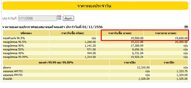 เรามาดูราคาของจริงตามตารางแสดงราคาทองคำที่สมาคมค้าทองคำประกาศ ณ วันที่ 1 พ.ย.56 เวลา 9.25 น.