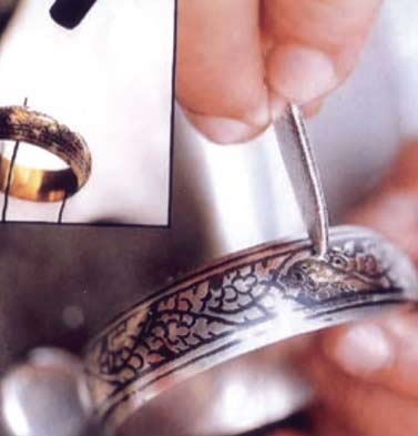 - การขึ้นรูป ต้องใช้เนื้อเงินไม่ต่ำกว่า 95% มาหลอมให้เป็นแท่งหรือแผ่น จากนั้นนำมาแผ่หรือรีดให้ได้ขนาดและความยาวตามต้องการ จากนั้นนำแผ่นเงินมาตีด้วยค้อนสลับกับการให้ความร้อนให้รูปทรงความโค้งรวมเข้าหรือขยายออกตามต้องการ