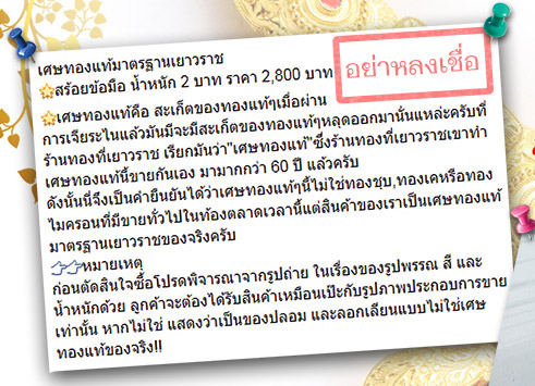 เพื่อนๆ หลายคนคงเคยเห็นเพจประกาศขายเครื่องประดับ "เศษทองแท้มาตรฐานเยาวราช" ตามตัวอย่างด้านล่างนี้ เคยสงสัยกันหรือไม่ว่า ตกลงแล้วสินค้าชนิดนี้เป็นทองแท้หรือไม่?