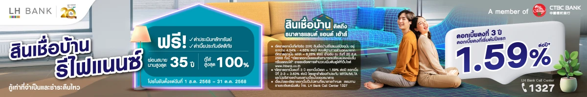 - อัตราดอกเบี้ย MRR = 7.305% ต่อปี ณ วันที่ 15 ส.ค. 68 อัตราดอกเบี้ยลอยตัวสามารถเปลี่ยนแปลงเพิ่มขึ้นหรือลดลงได้