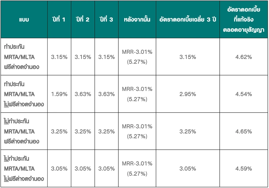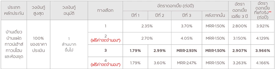 - ยกเว้นค่าประเมินราคาหลักทรัพย์, ค่าอากรสแตมป์ และค่าเบี้ยประกันอัคคีภัย 3 ปีแรก ทุกทางเลือก