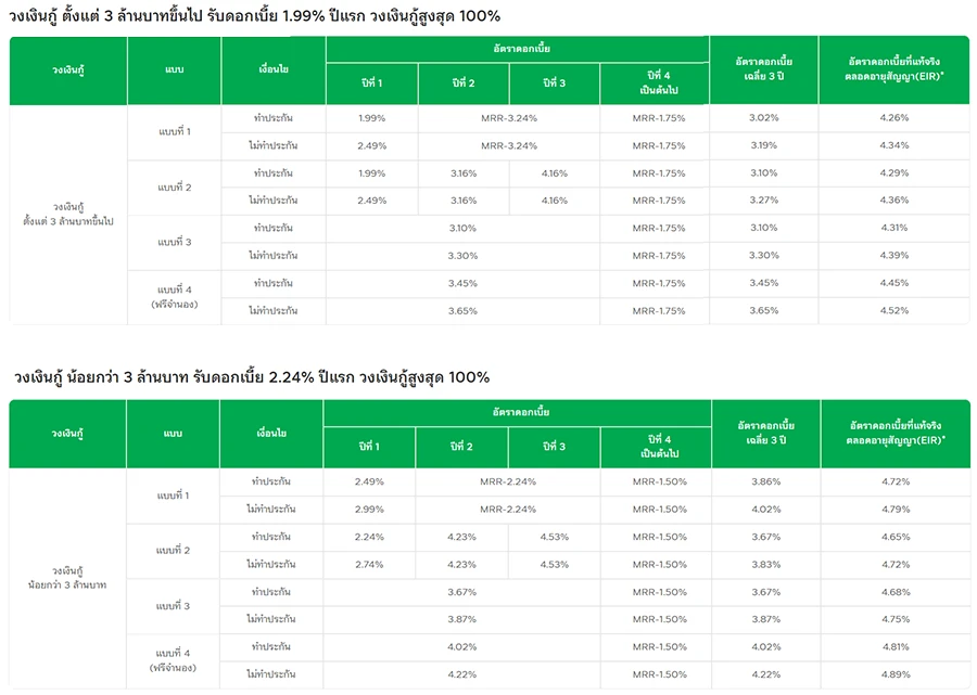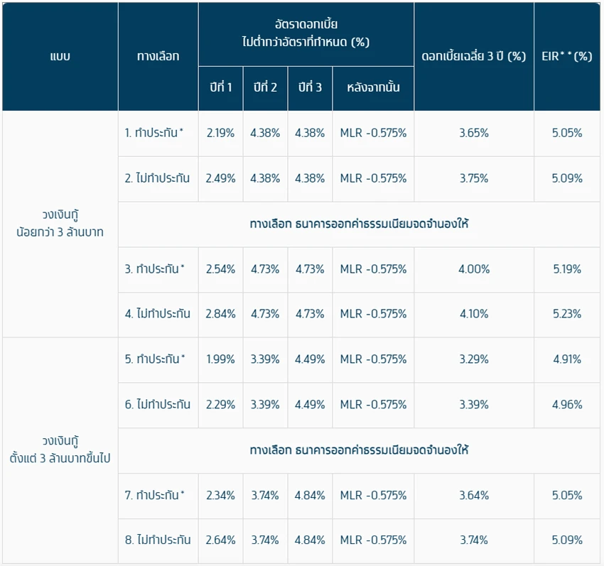 ทั้งนี้ การทำประกันชีวิตคุ้มครองวงเงินสินเชื่อ เป็นไปตามความสมัครใจของลูกค้า และไม่มีผลต่อการอนุมัติสินเชื่อ - อัตราดอกเบี้ยที่แท้จริง (EIR)** แบบวงเงินกู้ น้อยกว่า 3 ล้านบาท คำนวณจากวงเงินกู้ 1 ล้านบาท อายุสัญญา 20 ปี ผ่อนชำระเท่ากันทุกเดือนๆ ละ 7,500 บาท ประมาณการเป็นเงินต้นรวมดอกเบี้ยตลอดอายุสัญญา 1,470,620.73 บาท และ แบบวงเงินกู้ ตั้งแต่ 3 ล้านบาท ขึ้นไป คำนวณจากวงเงินกู้ 3 ล้านบาท อายุสัญญา 20 ปี ผ่อนชำระเท่ากันทุกเดือนๆ ละ 22,300 บาท/เดือน ประมาณการเป็นเงินต้นรวมดอกเบี้ยตลอดอายุสัญญา 4,367,345.88 บาท | MLR = 6.50% ต่อปี (ณ วันที่ 15 ส.ค. 68) ทั้งนี้ อัตราดอกเบี้ยลอยตัวสามารถเปลี่ยนแปลงเพิ่มขึ้นหรือลดลงได้