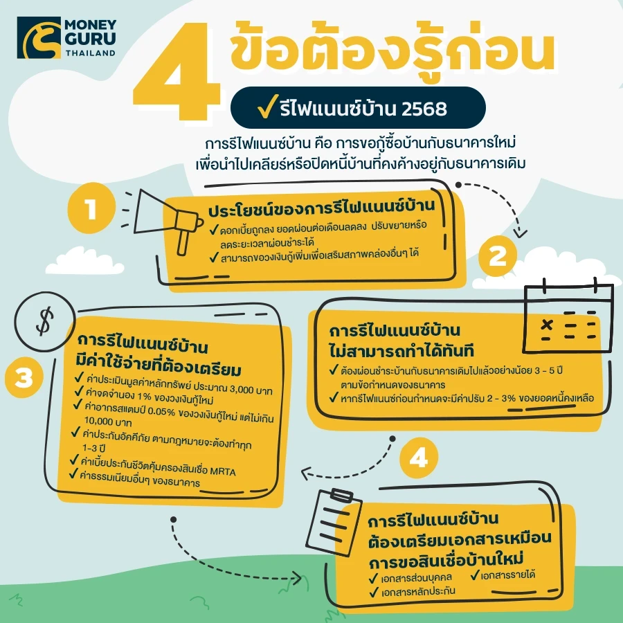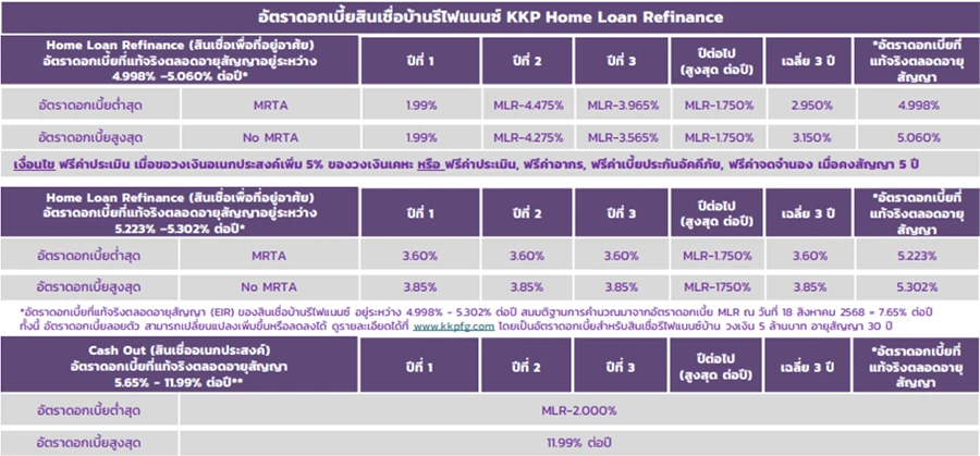 - อัตราดอกเบี้ยที่แท้จริง (EIR) สินเชื่อบ้านรีไฟแนนซ์ปัจจุบัน อยู่ระหว่าง 4.54% - 4.65% ต่อปี