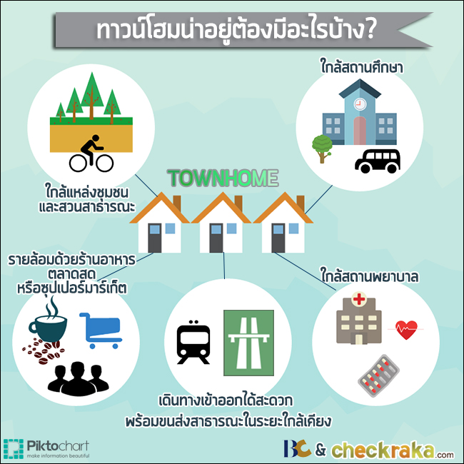 คนที่ทำงานอยู่ในเมือง และไม่ต้องการที่จะฝ่ารถ ติดตัวเลือกแรกๆ ที่นึกถึงเลยก็คือการหาซื้อคอนโดที่ใกล้กับที่ทำงาน เดินทางมาสะดวกด้วยรถไฟฟ้าหรือเดินเท้าก็ถึงที่ทำงาน แต่ปัจุบันนี้รถไฟฟ้าได้มีโครงการส่วนต่อขยายออกไปมากขึ้นส่งผลให้มีทาวน์โฮมทำเลดีๆ นั้นมีรถไฟฟ้าตัดผ่าน (จากตัวอย่างโครงการข้างต้น) และการเดินทางสะดวกขึ้นมาก อีกทั้งทาวน์โฮมยังมีพื้นที่สำหรับพักผ่อนหย่อนใจ สามารถจัดสวนหรือเลี้ยงสัตว์ได้ อีกครั้งเมื่อเทียบราคา ทำเล และพื้นที่แล้ว ทาวน์โฮมพรีเมียมก็อยู่ในระดับราคาที่พอๆ กับราคาคอนโดมิเนียมทีเดียว ในทางกลับกันทาวน์โฮมสามารถเติมเต็มคุณภาพชีวิตที่ดีกว่าได้ ทั้งเพื่อนบ้านที่คอยดูแลกัน หากใครมีครอบครัวก็จะมีพื้นที่ให้ลูกๆ ได้วิ่งเล่นกันได้อีกด้วย จากข้อมูลของ Bkkcitismart.com พบว่าในจำนวนคนซื้อทาวน์โฮมทั้งหมดนั้น 90% ซื้อมาอยู่เองจริง และ 10% ซื้อลงทุนปล่อยเช่า ทาวน์โฮมจึงเป็นรูปแบบการอยู่อาศัยที่เริ่มน่าสนใจและตลาดใหญ่ขึ้นเรื่อยๆ และปัจจุบันก็เป็นตัวเลือกหนึ่งที่น่าสนใจ สามารถตอบโจทย์ข้อด้อยของทั้งคอนโดและบ้านเดี่ยวได้อย่างลงตัวค่ะ ในครั้งหน้า Checkraka และ BC จะมานำเสนอบทความน่ารู้อะไรอีกนั้น อย่าลืมติดตามชมนะคะ