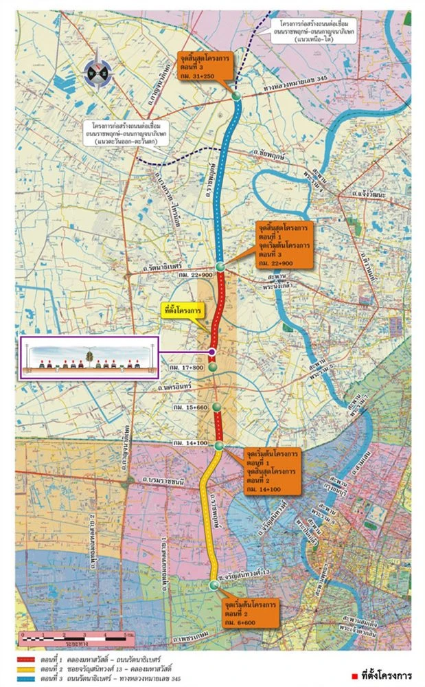 (ค) ตอนที่ 3 (สีฟ้าในรูปข้างล่าง) ระหว่างถนนรัตนาธิเบศร์ ถึง ทางหลวงหมายเลข 345 ระยะทาง 8.35 ก.ม. อยู่ในช่วงเสนองบประมาณ คาดว่าจะสามารถเริ่มก่อสร้างได้ประมาณช่วงปี 2559 เป็นต้นไป