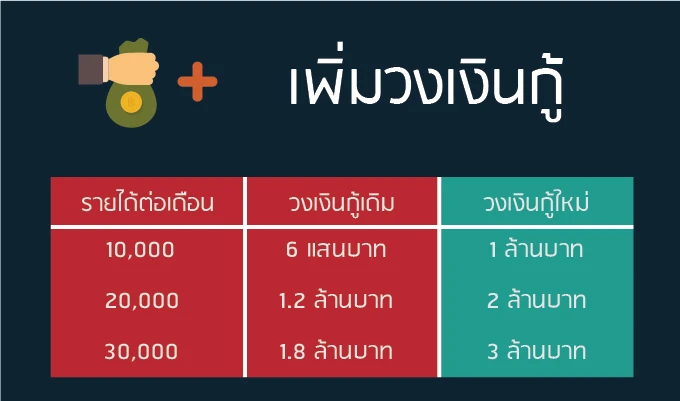 เป็นมาตรการที่ทาง ครม. เห็นชอบให้ ธอส. เตรียมวงเงินกู้กว่า 10,000 ล้านบาทเพื่อสนับสนุนการให้สินเชื่อที่อยู่อาศัยแก่กลุ่มผู้มีรายได้น้อยและปานกลางด้วยการผ่อนปรนเงื่อนไขสัดส่วนความสามารถชำระหนี้ต่อรายได้ หรือ Debt service ratio จากเดิม 33% เป็น 50% ของรายได้สุทธิต่อเดือน อธิบายง่ายๆ ก็คือ คนที่เงินเดือนต่ำกว่า 30,000 ต่อเดือนสามารถกู้ได้สูงสุดถึง 3 ล้านบาท จากเดิมที่สามารถกู้ได้เพียง 1.8 ล้านบาทเท่านั้น อีกข้อดีก็คือ มาตรการนี้ไม่ได้ระบุขีดจำกัดของวงเงินกู้ค่ะ สามารถกู้ได้มากกว่าหรือน้อยกว่า 3 ล้านบาทก็ได้ ถ้าคุณต้องการ มาดูตัวอย่างเปรียบเทียบกันค่ะ ระหว่างวงเงินกู้เดิม และวงเงินกู้รอบใหม่