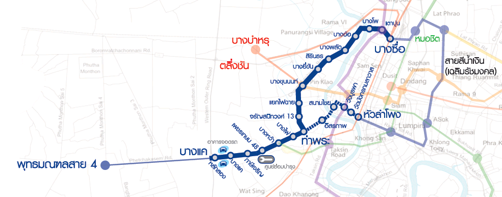 แผนที่รถไฟฟ้าสายสีน้ำเงิน บางซื่อ-ท่าพระ (ปัจจุบันกำลังก่อสร้าง คาดว่าจะเปิดให้บริการได้ปี 2562)