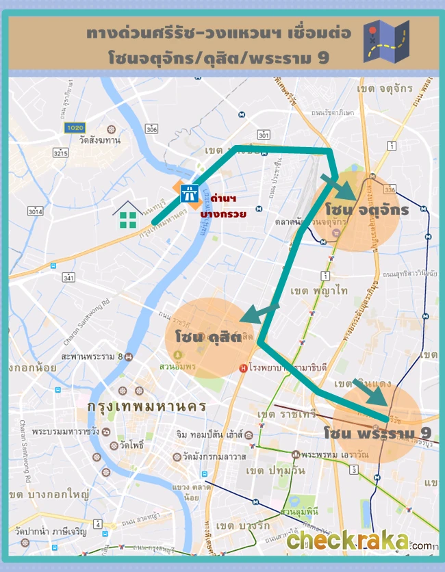 ถือได้ว่าเป็นมิติใหม่ในการเดินทางสำหรับคนในย่านฝั่งธนบุรีเลยค่ะ สำหรับการเปิดให้บริการของทางด่วนใหม่ศรีรัช-วงแหวนฯ ซึ่งมีเส้นทางจากวงแหวนรอบนอกฝั่งตะวันตกวิ่งมาตามเส้นทางรถไฟจนมาเชื่อมกับทางด่วนศรีรัชที่บริเวณจตุจักร ทำให้การเดินทางเข้าเมืองสะดวกขึ้นมาก ซึ่งจุดขึ้นลงทางด่วนใหม่นี้ก็อยู่ใกล้กับบ้านกลางเมือง ปิ่นเกล้า-จรัญฯ นี้แค่นิดเดียวเองค่ะ