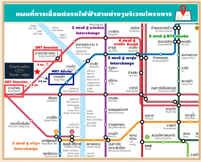 สำหรับการเดินทางด้วยรถไฟฟ้าในปัจจุบันมีรถไฟฟ้าสายสีแดงอ่อน บางซื่อ-ตลิ่งชัน ซึ่งห่างจากสถานีกลางบางซื่อ เพียงแค่ 4 สถานีเท่านั้น ปัจจุบันสายนี้ได้สร้างเสร็จแล้ว รอเปิดให้บริการพร้อมกับรถไฟฟ้าสายสีแดงเข้ม และสถานีกลางบางซื่อในช่วงปี 2563 ส่วนสถานีที่อยู่ใกล้กับโครงการ คือ สถานีบางบำหรุ และสถานีบางกรวย-กฟผ. โดยเฉพาะสถานีบางบำหรุนี้จะอยู่ใกล้หน่อย เพียงแค่ 1.8 กม. เท่านั้น ส่วนสถานีบางกรวย-กฟผ. เป็นสถานีในอนาคต (ห่างจากโครงการประมาณ 2 กม.) ส่วนรถไฟฟ้าสายสีน้ำเงิน บางซื่อ-ท่าพระ ปัจจุบันกำลังก่อสร้างอยู่เลยค่ะ คาดว่าจะเปิดให้บริการได้ในช่วงปี 2562 สถานีที่ใกล้กับโครงการ คื่อ สถานีบางพลัด (ห่างจากโครงการประมาณ 3.6 กม.)
