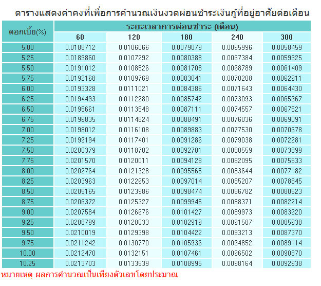เงินค่างวดรายเดือน = วงเงินต้นที่กู้ x ตัวเลขในช่องอัตราดอกเบี้ยแถวตั้งที่ตรงกับช่องระยะเวลากู้