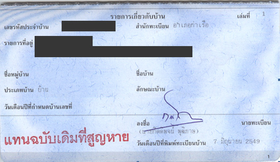 ในกรณีที่ทะเบียนบ้านฉบับเจ้าบ้านสูญหาย ให้เจ้าบ้านหรือผู้ที่ได้รับมอบหมาย (กรณีได้รับมอบหมายให้แนบหนังสือมอบอำนาจพร้อมบัตรประจำตัวประชาชนของเจ้าบ้าน และบัตรประจำตัวของผู้ได้รับมอบหมาย) มายื่นคำร้องต่อนายทะเบียนของท้องที่ที่บ้านหรือคอนโดหลังดังกล่าวตั้งอยู่ โดยนายทะเบียนผู้รับแจ้งจะจัดทำสำเนาทะเบียนบ้านฉบับเจ้าบ้านขึ้นใหม่โดยลงรายการในช่องบันทึกในสำเนาทะเบียนบ้านที่จัดทำขึ้นใหม่ว่า "แทนฉบับเดิมที่สูญหาย" และเรียกเก็บค่าธรรมเนียมตามที่กำหนดในกฎกระทรวงจำนวน 20 บาท ทั้งนี้ในการดำเนินการดังกล่าวไม่ต้องใช้เอกสารใดของผู้อาศัย โดยไม่ต้องแจ้งความกับตำรวจ