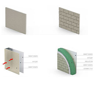 ผนังบ้านเป็น 2 ชั้น ทำด้วยทรายสังเคราะห์ เสริมด้วยฉนวนใยแก้วกันความร้อน และกระเบื้องเซรามิค ทำให้มีความแข็งแกร่ง ทนรอยขีดข่วน และไม่ต้องทาสีตลอดอายุของบ้านเลย ช่องว่างระหว่างผนังชั้นแรกกับผนังชั้นที่สอง (Air Gap) มีประโยชน์คือทำให้ความร้อนเข้าสู่ภายในบ้านได้ช้าลง และช่วยลดภาระของเครื่องปรับอากาศได้อย่างน้อย 25% นอกจากนั้นลายผนังด้านนอกยังมีความสวยงาม ทำให้ไม่ต้องทาสีบ้านเพิ่มเติม, กันเสียง, ไม่ขึ้นรา, ไม่เป็นตะไคร่ สามารถชำระล้างคราบสกปรกได้ด้วยน้ำฝน
