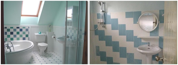 เจ้าของกระทู้มีภาพของบ้านที่อยากได้ในใจอยู่แล้ว หลักๆ เลยตัวบ้านก็อยากให้เป็นสีเหลืองและขาว ห้องข้างในอยากได้สีฟ้า และห้องน้ำโทนสีก็อยากได้ประมาณรูปข้างล่าง โดยขั้นตอนนี้ก็ขอให้เพื่อนที่เป็นสถาปนิกช่วยในการตกแต่ง และเลือกใช้อุปกรณ์ภายในบ้าน เรามาดูภาพเปรียบเทียบกันครับ