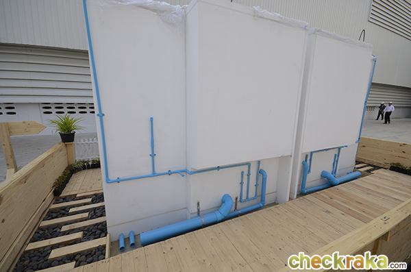 ด้านหลังของห้องน้ำจะเห็นการวางระบบท่อน้ำเป็นระเบียบเรียบร้อย พร้อมสำหรับการนำไปติดตั้งที่หน้างานแล้ว