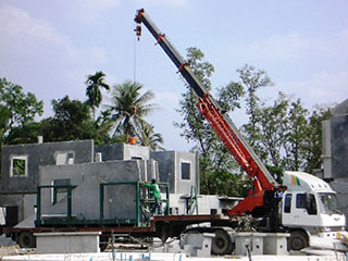 6. ติดตั้งพื้นชั้นบนโดยการยกแผ่นพื้นสำเร็จรูปวางลงผนังชั้นล่าง ยึดรอยต่อด้วยเหล็กเส้น และติดตั้งผนังชั้นบนต่อไป