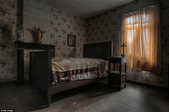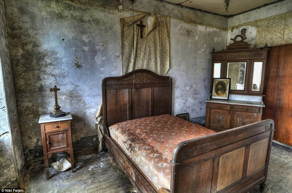 ห้องนอนที่เต็มไปด้วยสัญลักษณ์ของศาสนาคริสต์ ซึ่งตกแต่งอยู่โดยรอบห้องที่ผุพัง