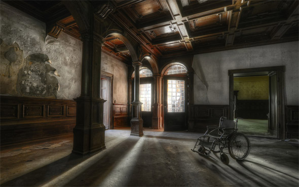 รถเข็นผู้ป่วยภายในบ้านร้างเก่าๆ
