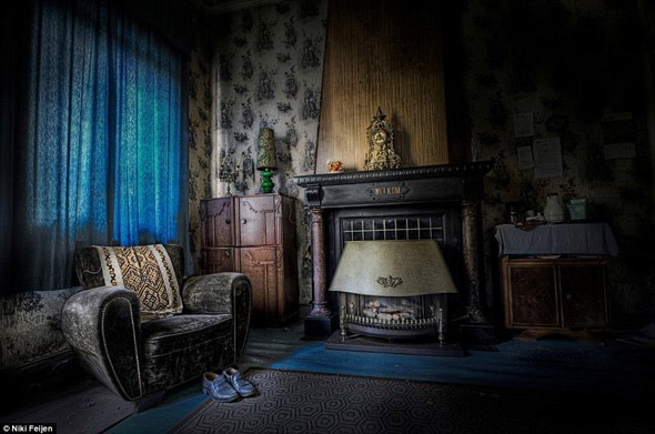 รองเท้าคู่เก่า กับเก้าอี้ที่ว่างเปล่า และเตาผิงพร้อมของประดับตกแต่งต่างๆ ที่ยังคงอยู่ในบ้านหลังนี้