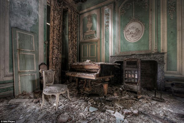 เปียโนไม้หลังใหญ่ที่ยังคงหลงเหลือ และตั้งอยู่ภายในบ้านที่ถูกทิ้งร้างในยุโรปตะวันตก
