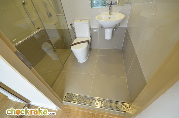 ส่วนห้องน้ำเลือกใช้ตะแกรงระบายน้ำแทนการก่อธรณี ป้องกันการสะดุดหรืออุปสรรคในการเข็นรถวีลแชร์เข้าไปในห้องน้ำค่ะ