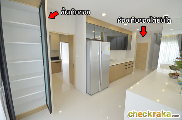 บริเวณ Pantry มีบิวท์อินชั้นเก็บของไว้ และมีพื้นที่สำหรับวางตู้เย็น ทำให้สะดวกหยิบของได้ง่ายไม่ต้องเดินเข้าไปในครัว