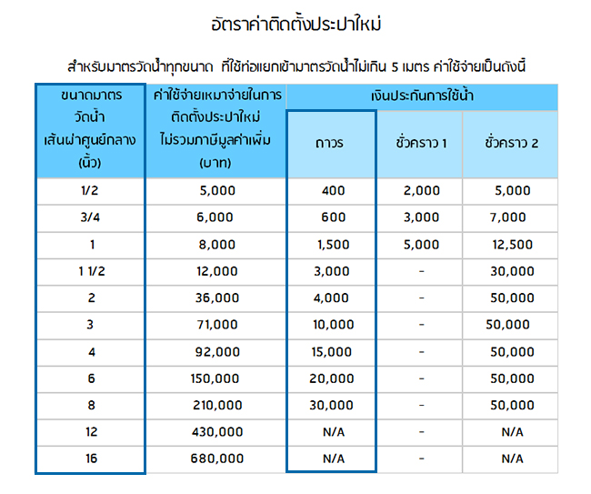 การขอใช้น้ำประปาใหม่ ทางโครงการจะให้จ่ายค่าประกันมิเตอร์น้ำในวันที่โอนกรรมสิทธ์ ค่าใช้จ่ายก็จะแตกต่างกันไปตามขนาดของมาตรวัดน้ำในแต่ละหลัง แต่โดยปกติก็จะมีขนาดตั้งแต่ 1/2 นิ้ว เงินประกัน 400 บาท, ขนาด 3/4 นิ้ว เงินประกัน 600 บาท และขนาด 1 นิ้ว เงินประกัน 1,500 บาท ซึ่งราคานี้ต้องขึ้นอยู่กับเงื่อนไขของแต่ละโครงการด้วยค่ะ
