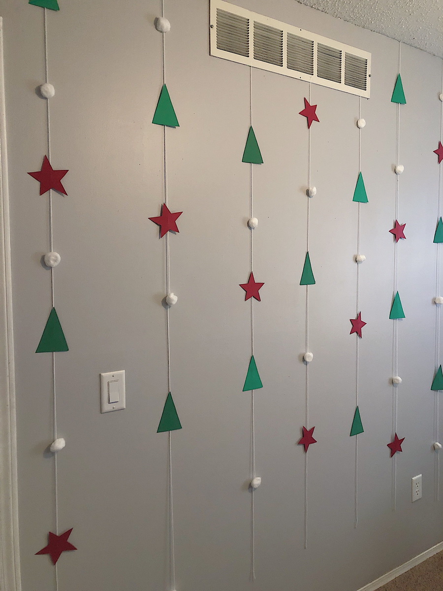 ไอเดียนี้ง่ายสุดๆ ไปเลยค่ะ เพียงแค่ตัดกระดาษเป็นรูปต้นคริสมาสต์ และรูปดาว แล้วร้อยเรียงเป็นแนวยาว แปะประดับที่ผนังบ้านก็ได้บรรยากาศของวันคริสมาสต์ขึ้นมาแล้ว