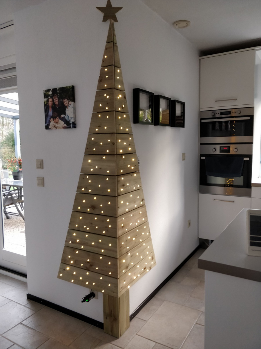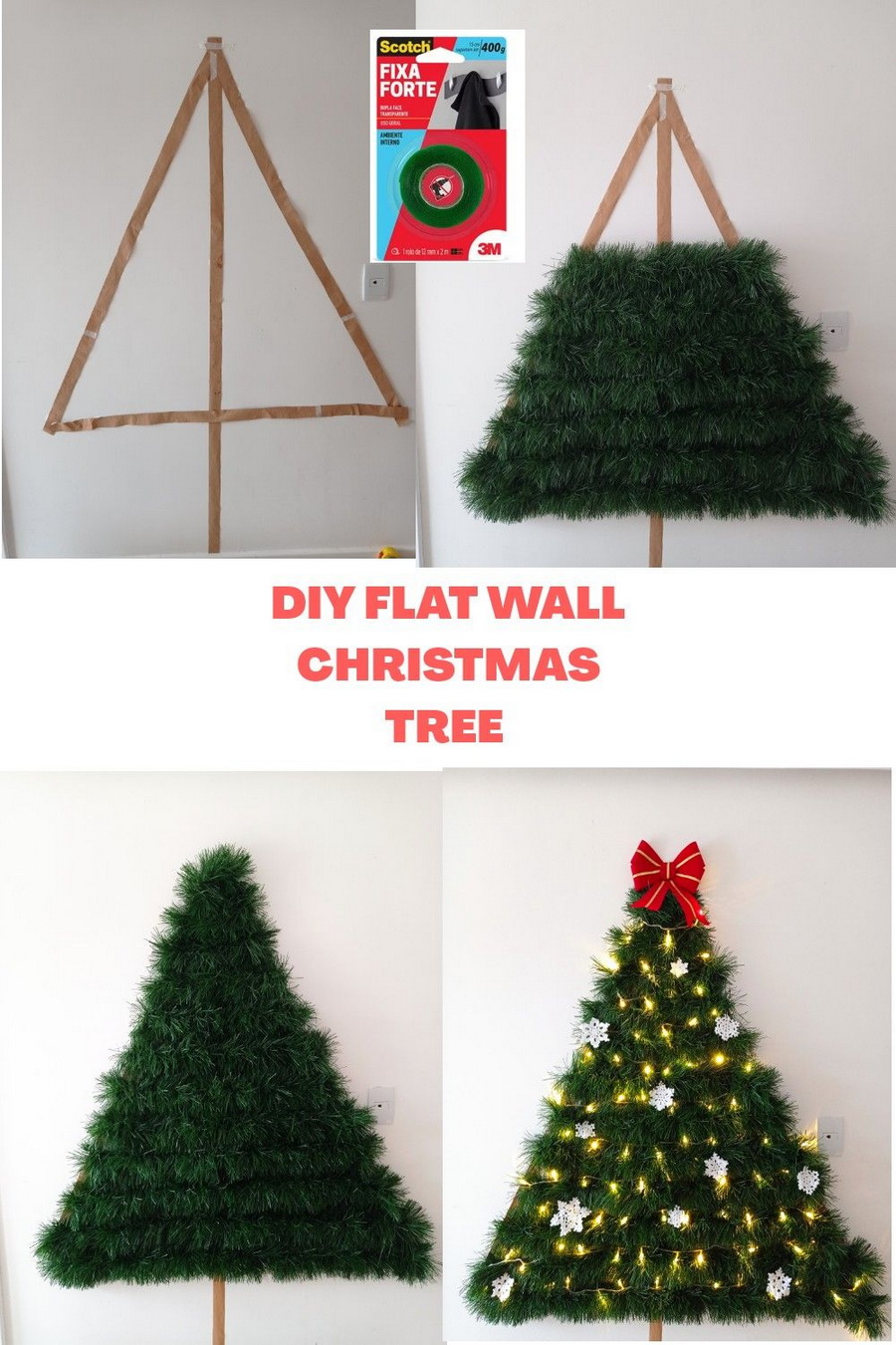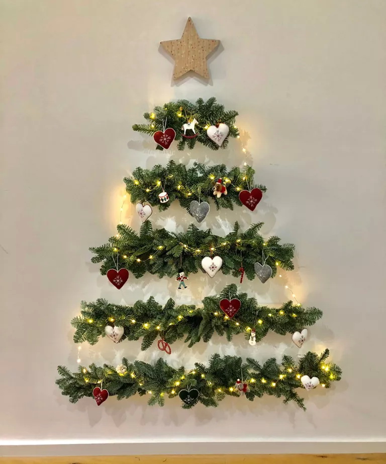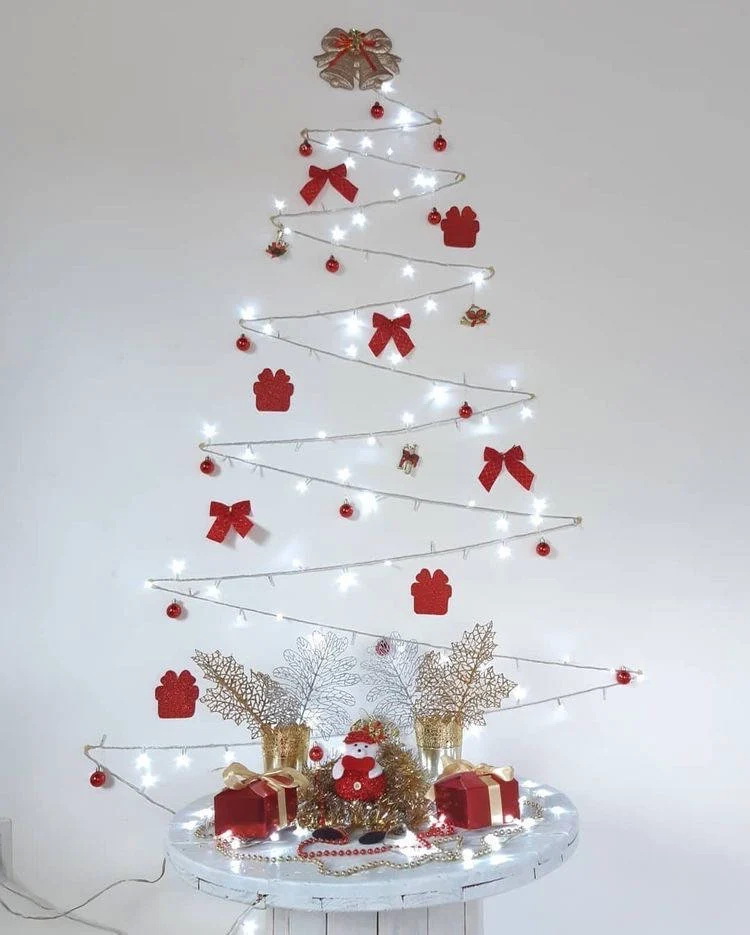 นำเส้นต้นสนมาดัดเป็นรูปต้นคริสมาสต์แล้วแปะไปที่กำแพง จากนั้นก็ห้อยด้วยลูกตุ้มตกแต่ง ประดับประดาด้วยไฟหลากสีเสียหน่อย ก็เป็นไอเดียที่ทำได้ง่ายๆ แถมออกมาเก๋ด้วยค่ะ