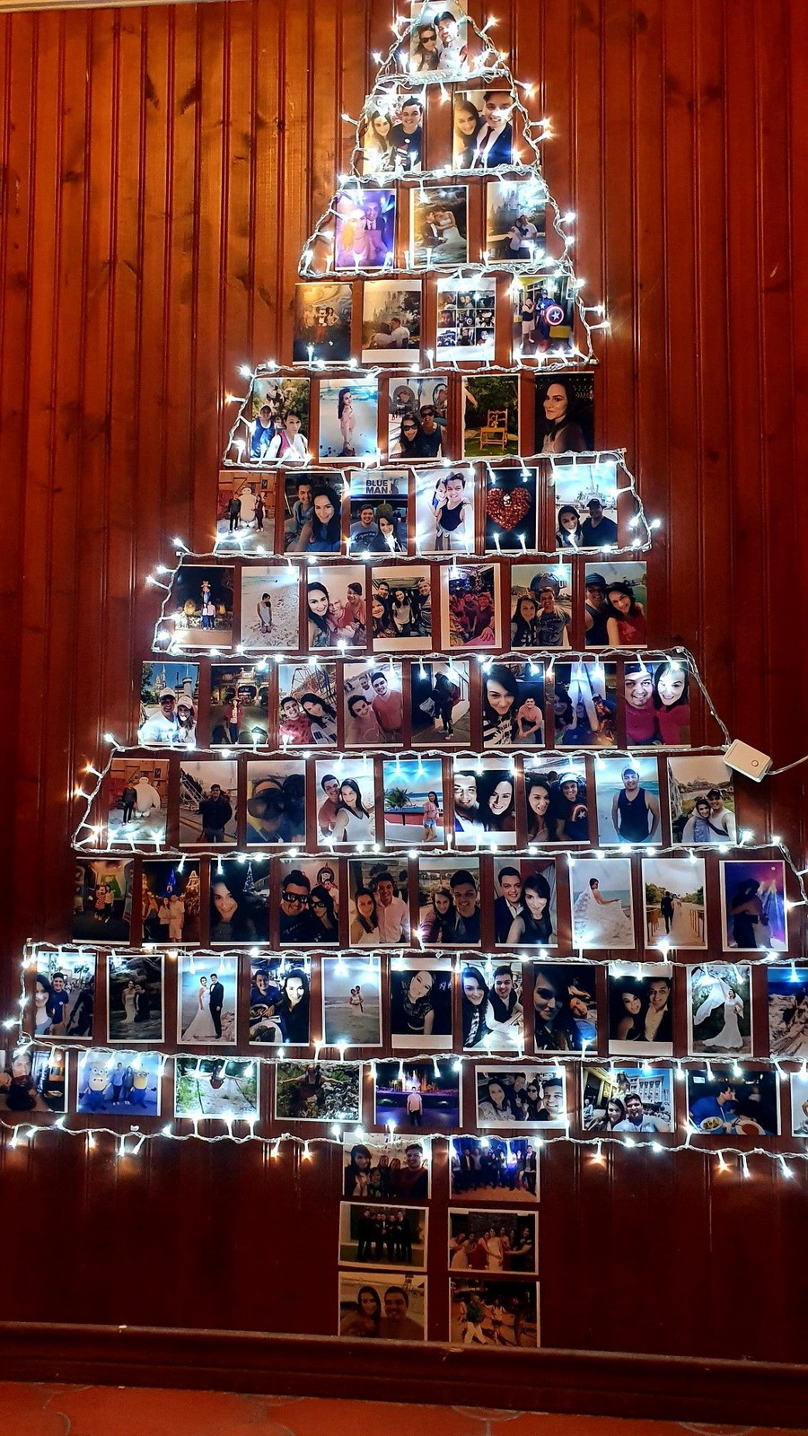 อันนี้ก็เหมาะสำหรับคนที่ชอบถ่ายรูป และมีรูปถ่ายอยู่เยอะแยะไปหมด นำมาวางเรียงกันเป็นรูปต้นคริสมาสต์ในผนังเดียว ให้เป็น 2 มิติ แล้วประดับด้วยหลอดไฟจิ๋วแบบนี้ก็ดูดีไม่แพ้ไอเดียอื่นๆ เลยค่ะ