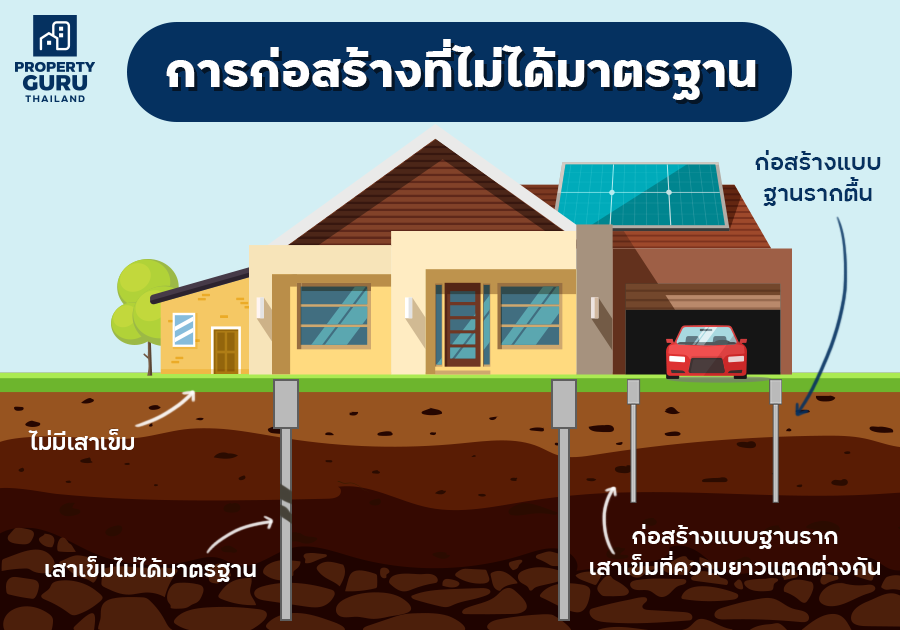 - ตรวจสภาพดินไม่ถูกต้องหรือแม่นยำพอ ทางทีมวิศวกรจะต้องมีการขุดเจาะดินเพื่อตรวจสภาพดินก่อน เพื่อจะได้รู้ว่าดินมีสภาพอย่างไร สามารถรับน้ำหนักได้เพียงพอหรือไม่ และยิ่งถ้าหากพื้นที่ตรงนั้นเคยมีแอ่งน้ำมาก่อนและไม่มีการตรวจสภาพดิน อาจทำให้การวางรากฐานบ้านเกิดความผิดพลาดได้