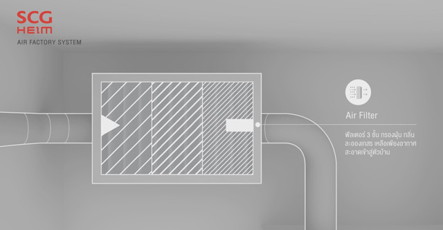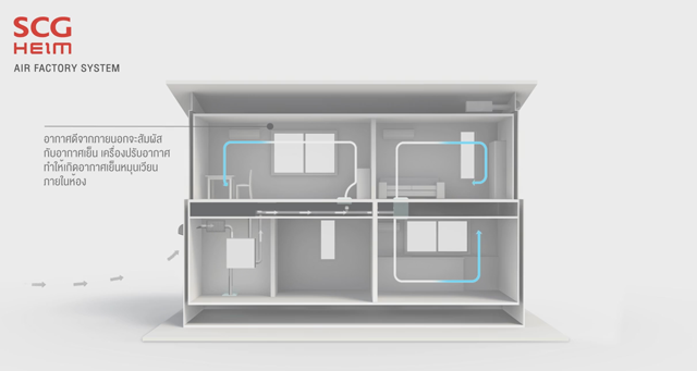 โดยปกติเรามักจะเปิดเครื่องปรับอากาศภายในบ้าน เพราะสภาพอากาศในประเทศไทยนั้นค่อนข้างร้อนอบอ้าว ทำให้การเปิดแอร์เป็นเรื่องจำเป็น แต่ถ้าจะเปิดตลอดทั้งวัน ก็คงจะต้องปวดหัวกับค่าไฟตอนสิ้นเดือน หรืออีกวิธีก็คือการเปิดหน้าต่างบ้าน เพื่อให้อากาศถ่ายเท และรับลมเย็นๆ จากภายนอกเข้ามา แต่ปัญหาหลักที่มาจากการเปิดหน้าต่างก็คือ ฝุ่นละออง ซึ่งอาจทำให้เกิดโรคภูมิแพ้ และอาการเจ็บป่วยตามมา แต่สำหรับบ้าน เอสซีจี ไฮม์ นั้นได้ถูกออกแบบมาพร้อมกับระบบที่เรียกว่า Air Factory System ซึ่งเป็นระบบหมุนเวียนอากาศพร้อมไส้กรอง 3 ชั้น จึงช่วยให้มั่นใจได้ว่า อากาศที่เข้ามาภายในบ้านนั้นเป็นอากาศที่บริสุทธิ์และปราศจากฝุ่น ละอองเกสร และเชื้อรา ที่เป็นสาเหตุของการเกิดโรคภูมิแพ้ และที่สำคัญยังมี Heat Exchanger ที่ช่วยปรับอุณหภูมิทำให้ไม่รู้สึกร้อน หรือเย็นจนเกินไป