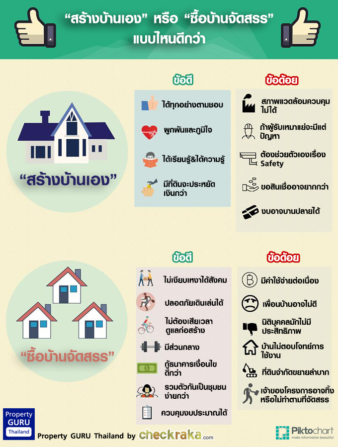 คำถามนี้เป็นหนึ่งในคำถามยอดฮิตในใจของทุกๆ คนที่กำลังมองหาบ้านเลยล่ะครับ บางคนอยากให้ทุกอย่าง "ถูกใจ" ก็อาจอยากปลูกเองสร้างเอง แต่บางคนอาจไม่ได้ให้ความสำคัญกับเรื่องพวกนี้มากนัก "อยู่ง่ายกินง่าย" ก็อาจอยากซื้อบ้านสำเร็จรูปในโครงการจัดสรร ซึ่งคำถามนี้ไม่มีคำตอบที่ "ถูก" หรือ "ผิด" ครับ ทั้งสองแบบมีข้อดี และข้อเสียแตกต่างกัน และหลายๆ ครั้งก็ขึ้นอยู่กับปัจจัยหลายอย่าง เช่น "ความชอบ" และ "จำนวนเงินในกระเป๋า" เหมือนกันครับ วันนี้ Checkraka.com เราสรุปข้อดี และข้อเสียของทั้งสองแบบมาฝาก พร้อมทั้งมีตัวช่วยไว้สอบถามตัวเราเองด้วยว่า เราเหมาะกับ "ปลูกสร้างบ้านเอง" หรือ "ซื้อบ้านจัดสรรจากโครงการ" ครับ?