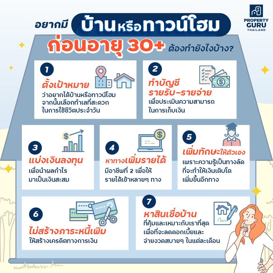 บ้านคือที่สุดของสินทรัพย์ที่ทุกคนอยากมีไว้ครอบครอง น้องๆ รุ่นใหม่หลายคนมีความตั้งใจอยากซื้อบ้านเป็นของตัวเองให้ได้ก่อนอายุ 30+ ถือเป็นความตั้งใจดีที่น่าส่งเสริม คิดได้ก่อนก็เริ่มได้เร็ว คนที่เริ่มกู้ซื้อบ้านเร็วก็จะมีระยะเวลาในการผ่อนส่งค่างวดได้นานกว่า (สูงสุด 30 ปี) ทำให้ภาระค่างวดรายเดือนไม่หนักมาก แถมถ้าซื้อประกันชีวิตคุ้มครองการส่งค่างวดบ้าน เบี้ยประกันก็จะมีราคาที่ถูกกว่าคนที่กู้ซื้อบ้านตอนอายุเยอะ CheckRaKa.com ส่งเสริมความคิดดีๆ ขอร่วมแชร์ขั้นตอนที่จะทำให้คุณกลายเป็นเจ้าของบ้านในฝันได้ก่อนอายุ 30+ ค่ะ
