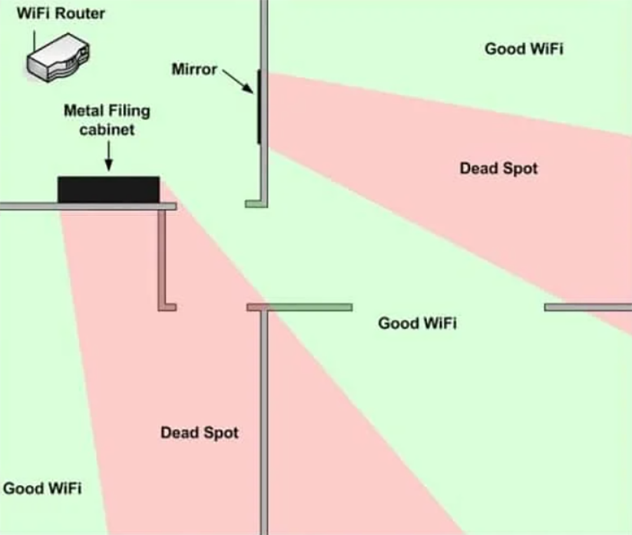 จะส่งผลให้สัญญาณอ่อนลงได้ (เงาสีชมพูคือจุดที่สัญญาณจะอ่อน หรือบอด (Dead Spot) เพราะถูกกระจก และวัตถุโลหะบัง) ขอบคุณภาพ : techpp.com