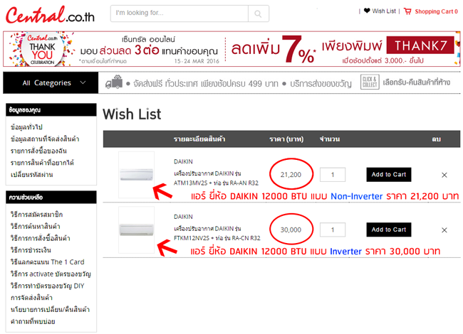 ตัวอย่างหน้าจอ Shop Online ของ Central Online แสดงรุ่นของ แอร์ไดกิ้น และ แอร์มิตซูบิชิ
