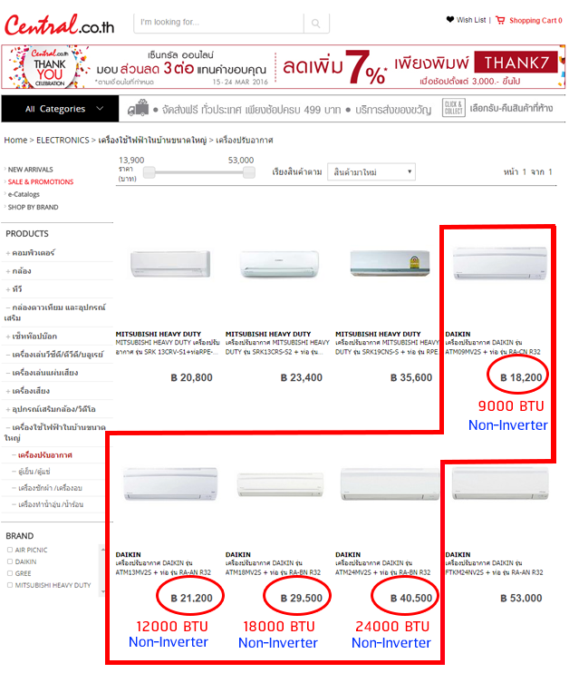 ตัวอย่าง เปรียบเทียบ ราคาแอร์ ยี่ห้อเดียวกัน แบบ Non-Inverter เหมือนกัน