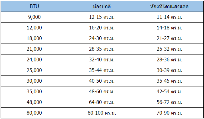 ก่อนอื่นมาทำความรู้จักกับ BTU กันก่อนนะคะ BTU (British Thermal Unit) เป็นหน่วยที่ใช้วัดปริมาณความร้อนแบบหนึ่งของอังกฤษที่ใช้กับแอร์ และเครื่องทำความเย็นประเภทต่างๆ ค่ะ โดยความร้อน 1 BTU คือ ปริมาณความร้อนที่จะทำให้น้ำ 1 ปอนด์ มีอุณหภูมิเปลี่ยนแปลงไป 1 องศาฟาเรนไฮต์ หากเราเลือกซื้อแอร์ที่มีขนาด BTU ที่สูงไป Compressor ก็จะตัดบ่อย ห้องก็จะมีความชื้นสูง และสิ้นเปลืองไฟโดยไม่จำเป็นค่ะ ส่วนถ้าเราเลือกซื้อแอร์ที่มีขนาด BTU ที่ต่ำไป Compressor ก็จะทำงานตลอดเวลา ไม่ตัดเลย เพราะทำความเย็นไม่ถึงตามที่เราปรับไว้ เนื่องจากกำลังไม่พอ อายุการใช้งานของเครื่องก็จะสั้นลง รวมถึงเปลืองค่าไฟโดยรวมอีกด้วยค่ะ เพราะฉะนั้นถ้าจะให้ดีที่สุด เราควรเลือกซื้อแอร์บ้านให้เหมาะสมกับขนาดของห้องให้มากที่สุดค่ะ ดูได้ง่ายๆ จากตารางด้านล่างนี้เลยค่ะ