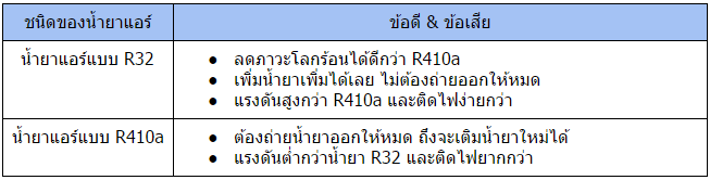 แอร์บ้านแต่ละรุ่นที่ผลิตออกมาจากโรงงาน ก็จะใช้ชนิดน้ำยาแอร์ที่ต่างกันค่ะ ในปัจจุบันที่นิยมใช้กันส่วนมากก็จะเป็นน้ำยาแอร์แบบ R32 และ R410a ซึ่งมีลักษณะเฉพาะที่ต่างกันตามตารางด้านล่างค่ะ