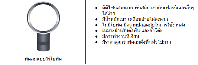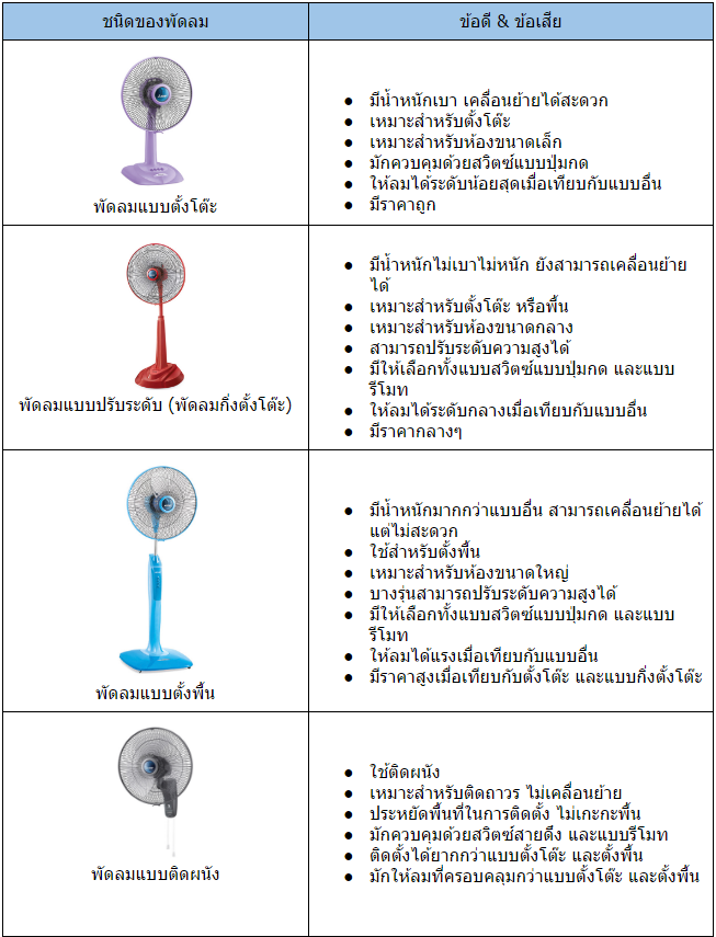 สำหรับการเลือกซื้อพัดลม ที่ใช้ทั่วไปในที่พักอาศัยนั้นจะมีอยู่หลายแบบค่ะ ซึ่งแต่ละแบบก็จะมีลักษณะการใช้งาน และข้อดีข้อเสียที่ต่างกันไป ดูได้จากตารางด้านล่างได้เลยนะคะ