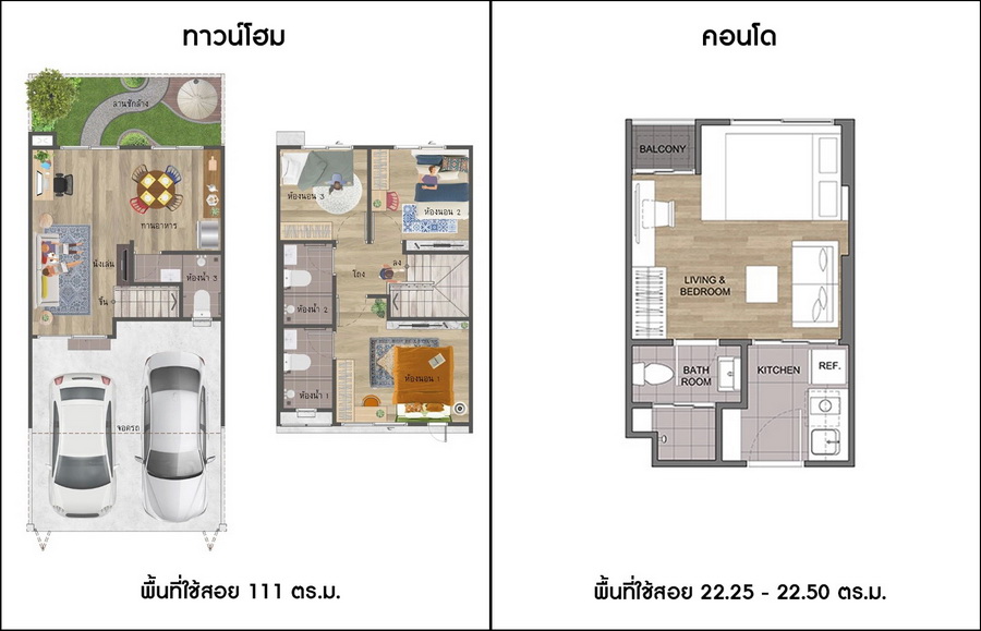 ปรียบเทียบพื้นที่ใช้สอยระหว่างทาวน์โฮม 2 ชั้น และคอนโดขนาด 1 ห้องนอน