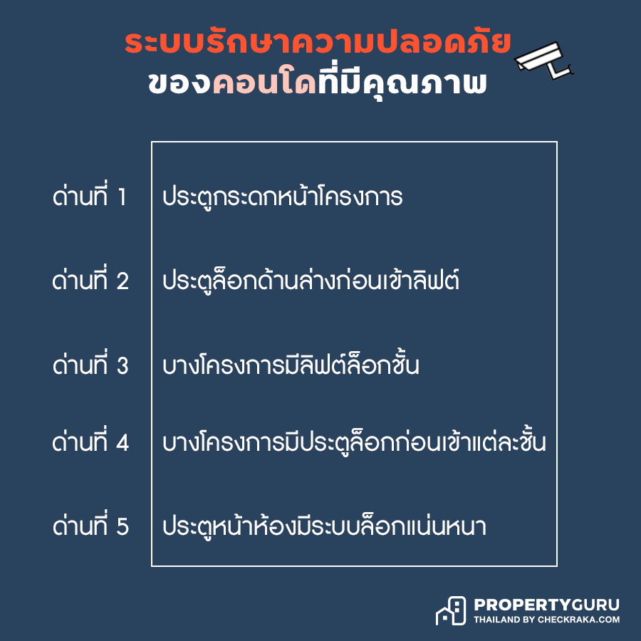 ความปลอดภัยมากกว่า หากทิ้งห้องไว้ไม่ได้อยู่นานๆ - พื้นที่ของคอนโดมักจะไม่ได้กว้างขวางมากและไม่ค่อยมีจุดอับ จึงทำให้ทั้งการติดตั้งกล้องวงจรปิดและพนักงานรักษาความปลอดภัยสามารถทำหน้าที่ได้ดีกว่าพื้นที่ใหญ่ๆ อย่างตามหมู่บ้าน โดยเฉพาะอย่างยิ่งคนที่โสดหรืออยู่คนเดียว อยู่คอนโดจะทำให้อุ่นใจมากยิ่งขึ้น