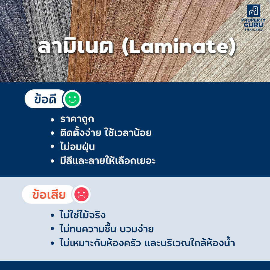 ลามิเนต เป็นวัสดุที่ได้รับความนิยมสูงสุดในปัจจุบันค่ะ พบได้บ่อยๆ ในคอนโดและบ้านเลย เนื่องจากราคาไม่สูง แต่มีคุณสมบัติที่ดีครบครัน ลามิเนตไม่ใช่ไม้จริง 100% แต่เกิดจากการนำเศษไม้มาผ่านกระบวนการทางวิทยาศาสตร์ ลามิเนตหาซื้อได้ง่าย มีลวดลายและสีสันให้เลือกจุใจ แต่ข้อเสียที่เห็นได้ชัดคือ กลัวน้ำสุดๆ น้ำหกต้องรีบเช็ด ไม่เหมาะกับพื้นที่ชื้นหรือโดนน้ำบ่อยๆ ไม่แนะนำให้ปูลามิเนตที่พื้นบ้านชั้นล่าง เพราะความชื้นจากพื้นดินจะทำให้อายุการใช้งานสั้นลงค่ะ