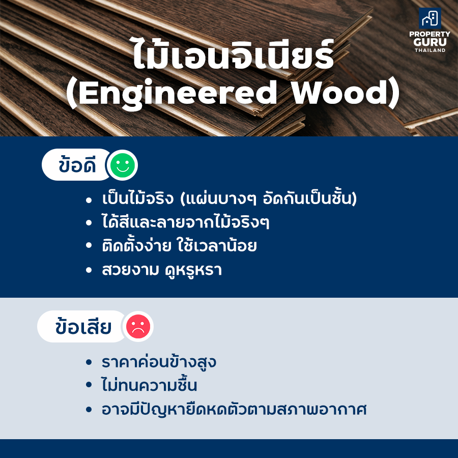 ไม้เอนจิเนียร์ คือไม้จริงค่ะ แต่เกิดจากการนำไม้แผ่นบางๆ มาอัดรวมกัน 3 ชั้น คอนโดหลายโครงการเริ่มนำวัสดุปูพื้นประเภทนี้มาใช้กันบ้างแล้ว ส่วนใหญ่อยู่ในโครงการระดับ High นิดนึง พื้นที่ปูด้วยไม้เอนจิเนียร์จะให้ความรู้สึกหรูหรา สวยงาม ดูด้วยตาแทบไม่ต่างจากแผ่นไม้แท้ๆ เลย แต่ราคาก็ค่อนข้างสูง ความทนทานก็ยังไม่เท่าไม้จริง