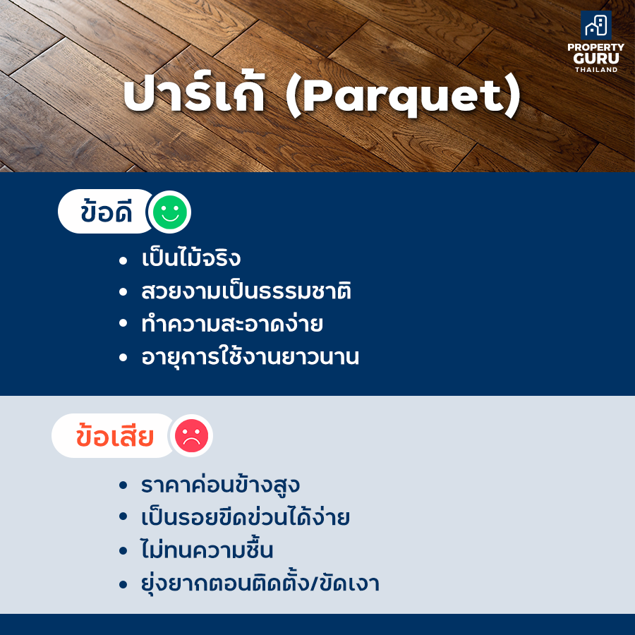 ปาร์เก้ เป็นวัสดุปูพื้นที่นิยมกันมาอย่างยาวนาน เป็นไม้จริง ทำมาจากไม้หลายชนิดค่ะ ในไทยนิยมไม้สัก, ไม้มะค่า, ไม้แดง ซึ่งทนทานมาก แต่ราคาก็สูงเอาการทีเดียว ปาร์เก้ที่ขัดสีเคลือบเงาเรียบร้อยแล้ว จะสวยเป็นเอกลักษณ์มากค่ะ ข้อเสียที่พบได้บ่อยคือพื้นเป็นรอยขีดข่วนง่าย และไม่ทนความชื้น สำหรับคนชอบงานไม้ธรรมชาติแท้ๆ และไม่เกี่ยงเรื่องราคา แนะนำปาร์เก้เลยค่ะ