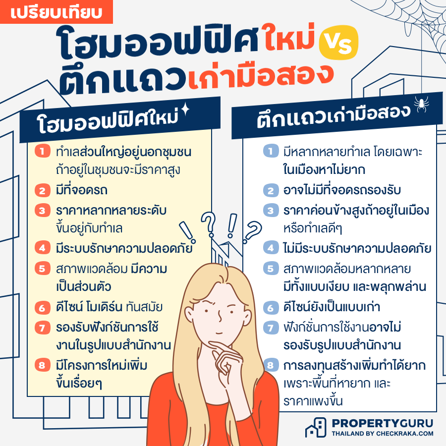 หลักๆ แล้ว โฮมออฟฟิศใหม่ กับ อาคารพาณิชย์เก่ามือสอง (ตึกแถว) คือ อาคารที่อยู่อาศัยที่ใช้สำหรับประกอบธุรกิจขนาดเล็กเหมือนกัน แต่ก็มีความแตกต่างกันในด้านของรายละเอียดปลีกย่อย วันนี้เราจะมาเปรียบเทียบให้ดูว่า อาคารที่อยู่อาศัยเชิงพาณิชย์ทั้งสองแบบนี้ มีความแตกต่างกันอย่างไร แต่ละแบบมีข้อดี ข้อเสียอย่างไรบ้าง ซึ่งน่าจะพอเป็นข้อมูลเบื้องต้นสำหรับผู้ที่กำลังมองหา หรือต้องการประกอบธุรกิจขนาดเล็กได้บ้างค่ะ