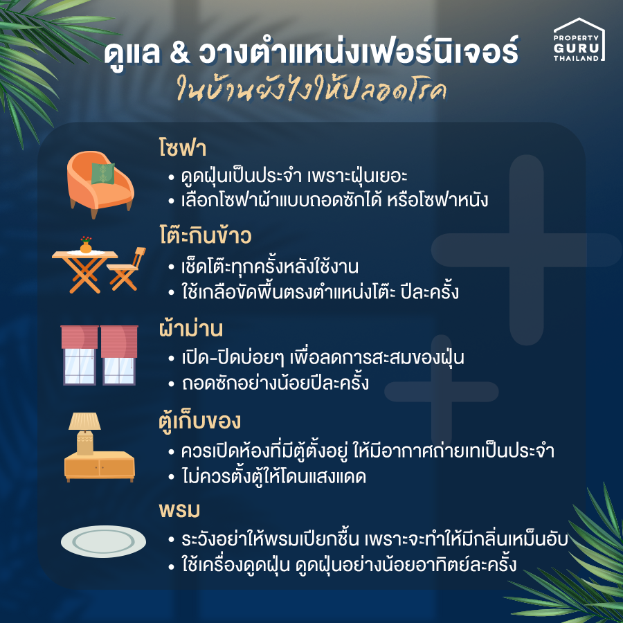 - ผ้าเป็นที่สะสมของฝุ่น ควรดูดฝุ่นเป็นประจำ